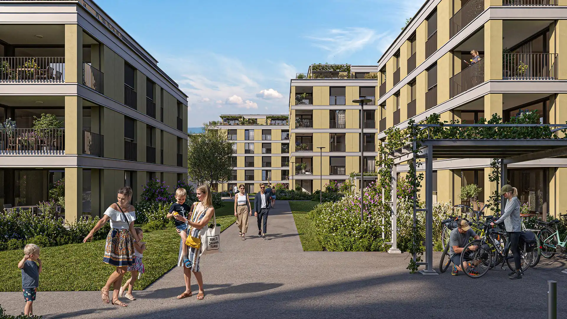 Zehn Gebäudeeinheiten in moderner, zukunftsgerichteter Architektur und grosszügige Grünflächen gliedern sich harmonisch um das historische Herzstück des neuen Quartiers: Eine alte Mühle, die als Begegnungszentrum einen kontrastreichen geschichtlichen Akzent setzt. Machen Sie sich ein Bild von Ihrer zukünftigen Traumwohnung.